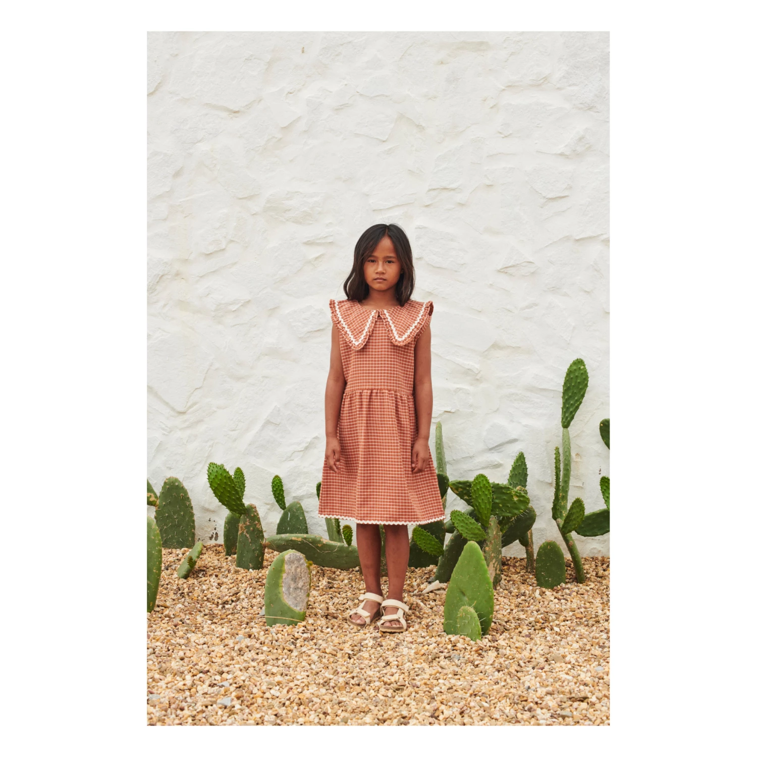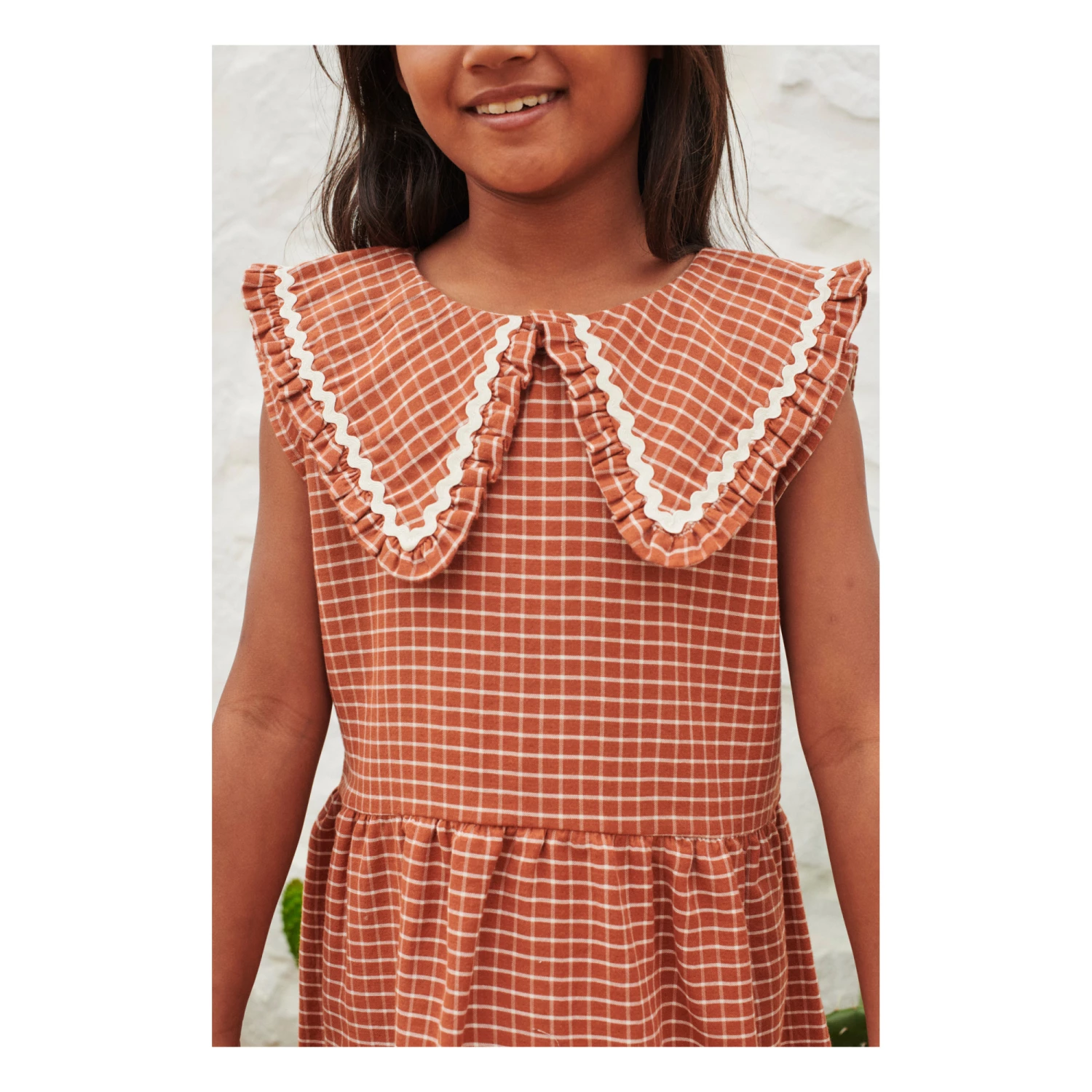 - Crew neck, Satin stitch edge finish, Knife pleat(s), Sleeveless, Frilled collar