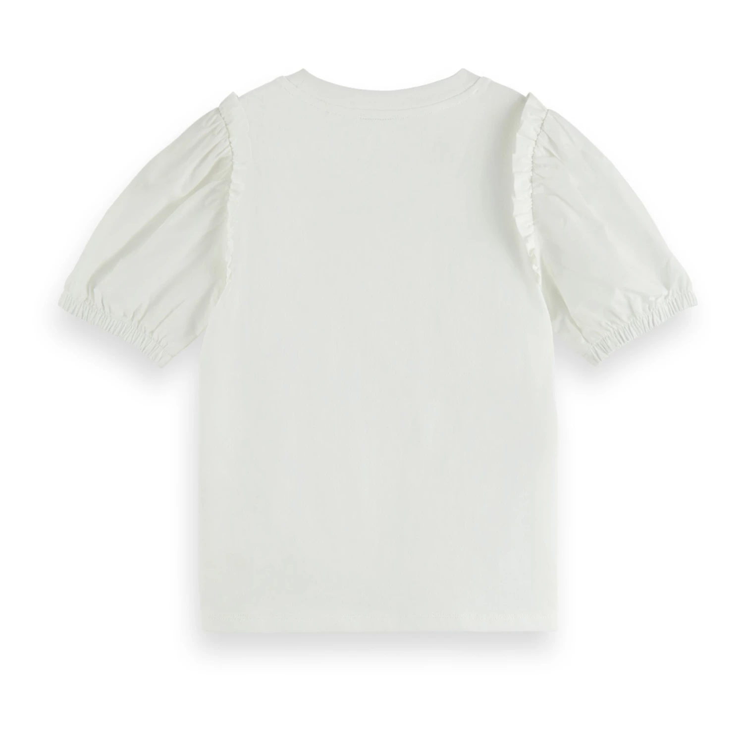 - Gathered armholes, Frilled sleeves, Crew neck, Balloon sleeves, Short sleeves, Sewn-in brand label, Ribbed neckband