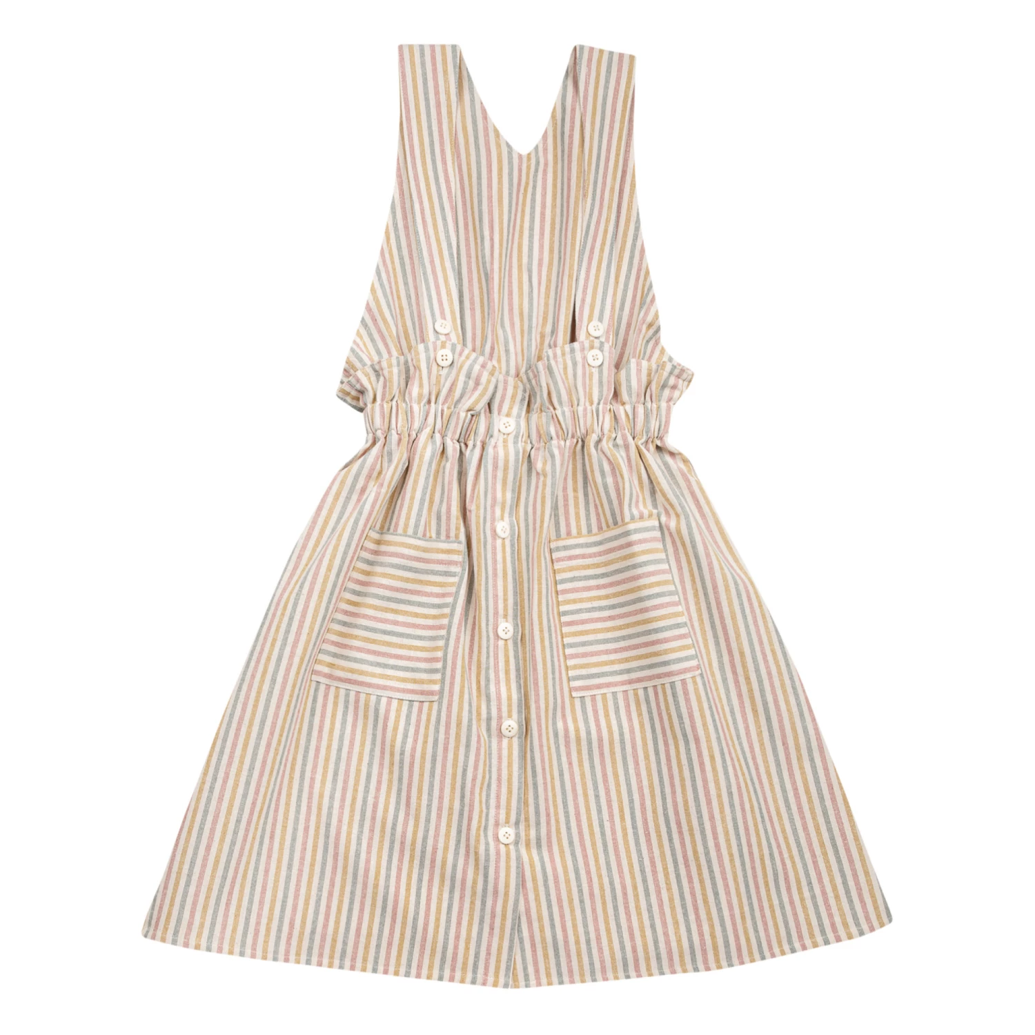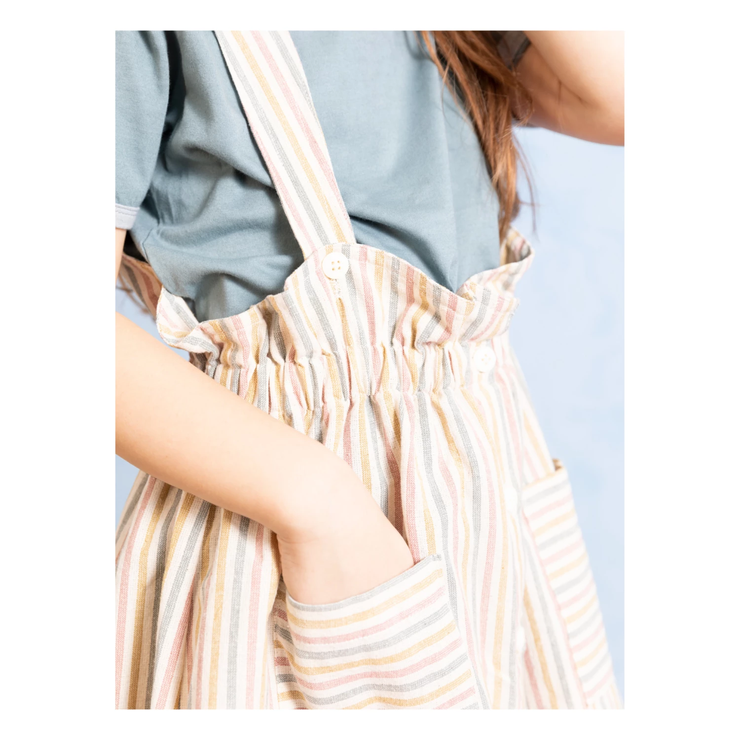 - Top stitched, Flowy, Front patch pocket(s), Back patch pocket(s), Elasticated waist, Gathered at the waist, Straps with buttons, Comfortable