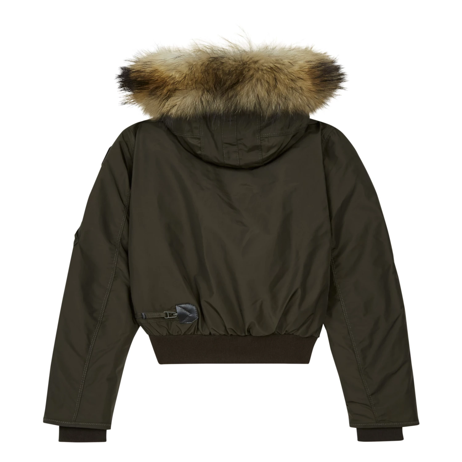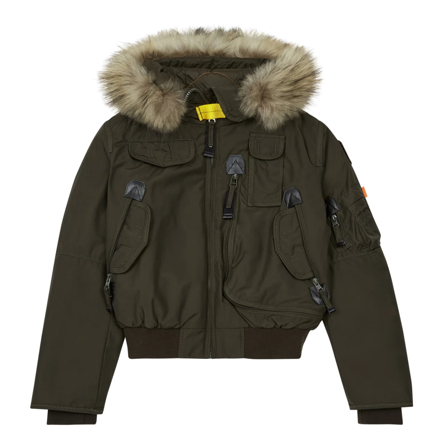 - Hooded bomber with removable genuine fur trim and removable down lining. The jacket is made of recycled nylon oxford with protective treatment and polyurethane lamination inside. Heat-sealed seams on the hood, shoulders and armholes. Multiple pockets, including a spacious front cargo pocket with mesh pocket, as well as two inside pockets and a pocket on the left sleeve. Reinforced elbow patches. Ribbed cuffs and bottom hem. Front zipper closure. Collar with iconic yellow elastic strap closure and PJS crest on left sleeve.