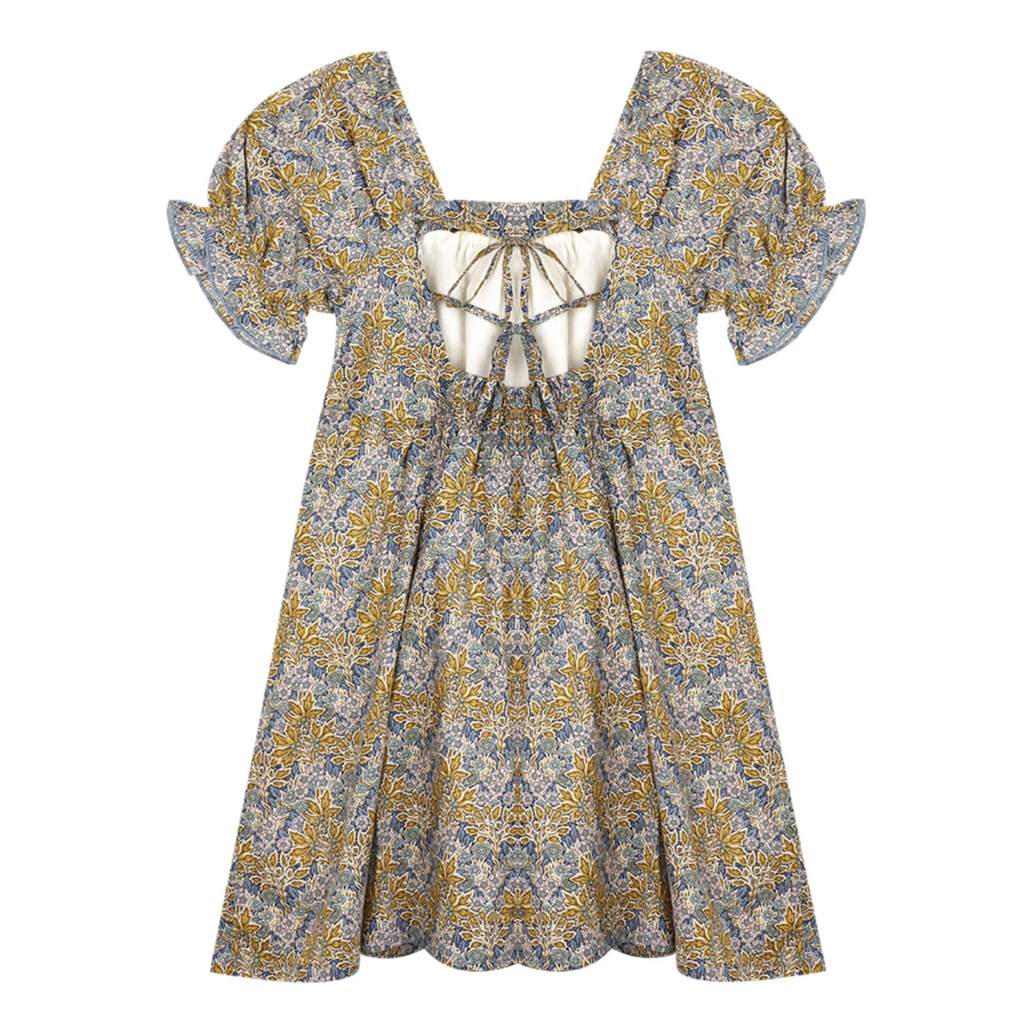 - Elastic sleeves, Flounce sleeve, Low-cut back, Square neck, Flowy, Balloon sleeves, Short sleeves, Knife pleat(s)