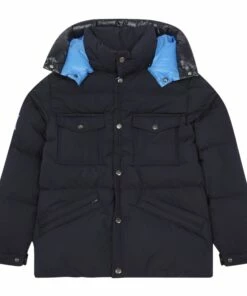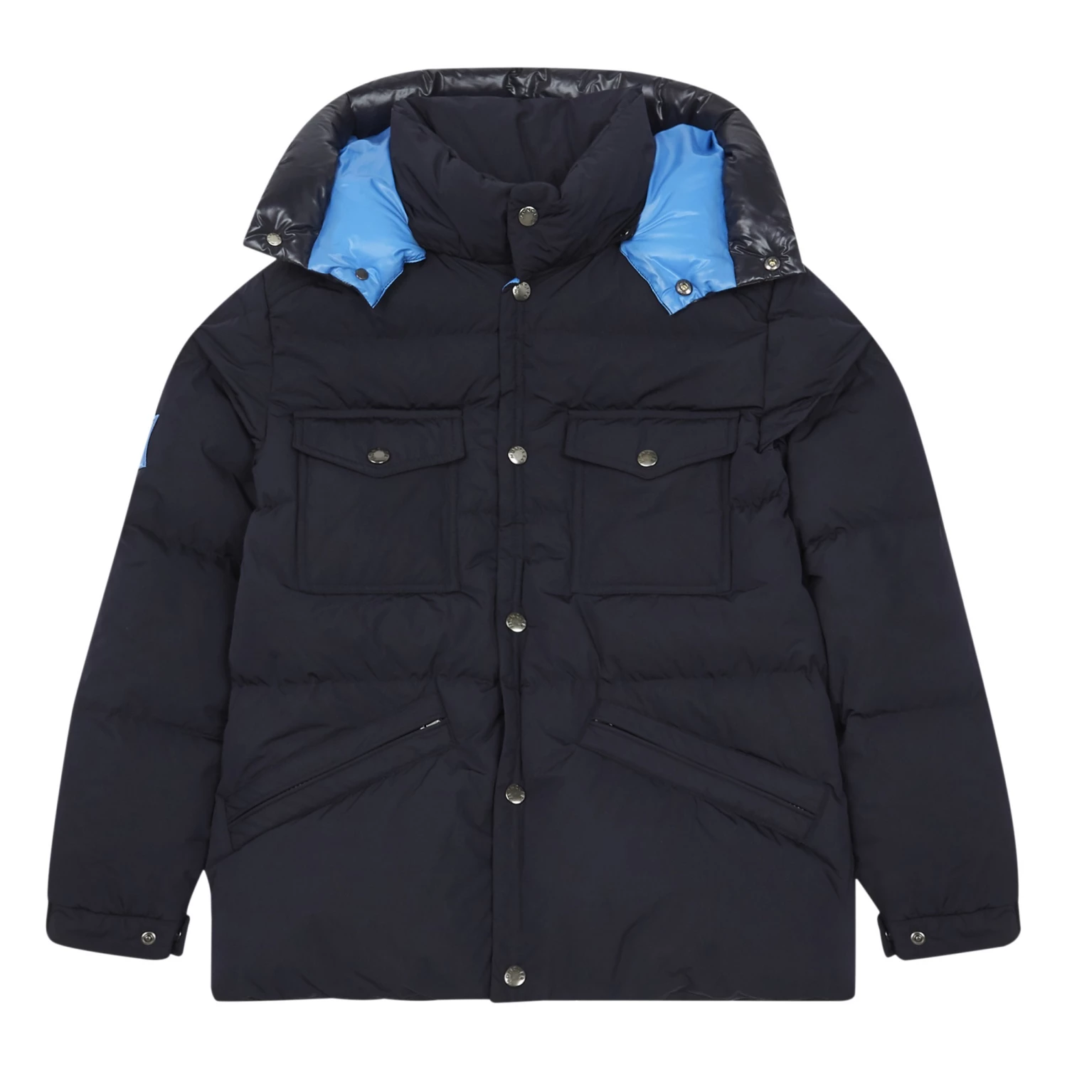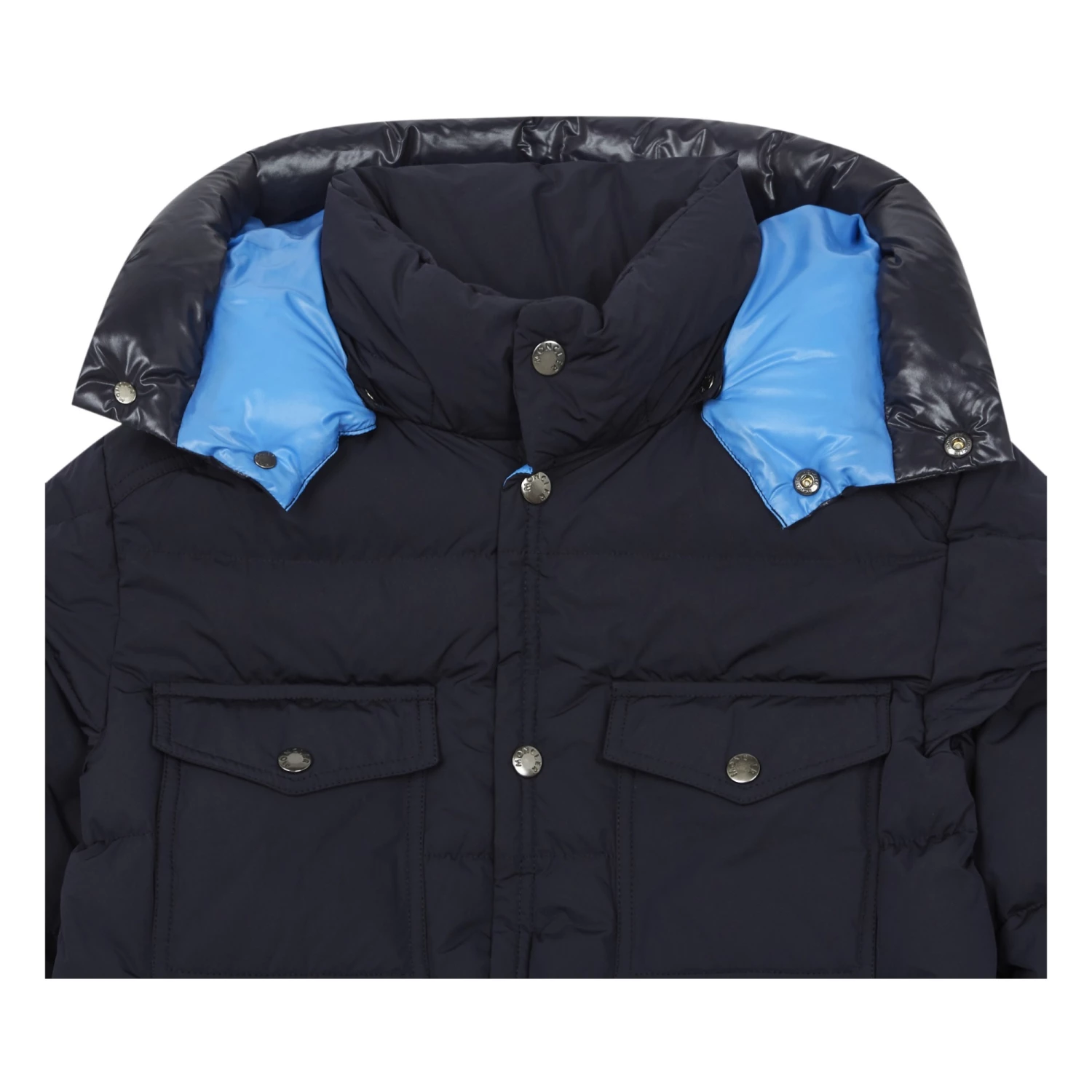 - Details : Two-tone, with Hood, High collar, Long sleeves, Zipper pockets, Flap pockets, Zip under button tab, Lining, Product protected by digital ID code, Felt logo, Removable hood, Two materials, Warm and comfortable, Tightened at the wrist